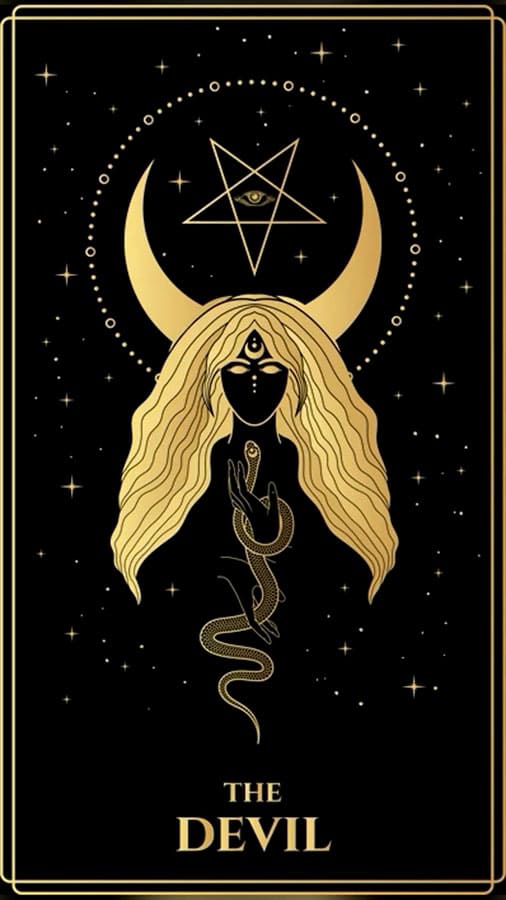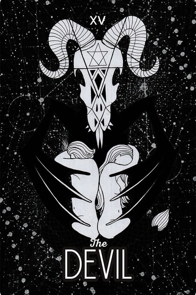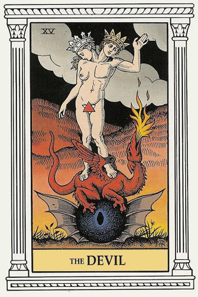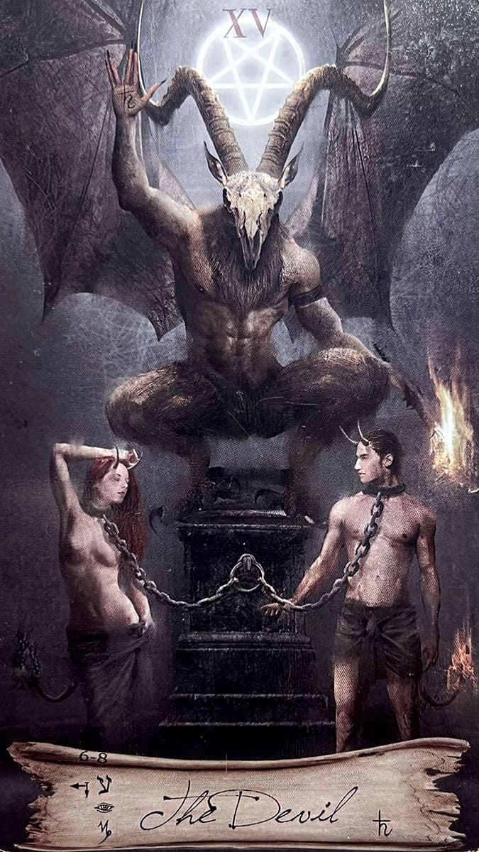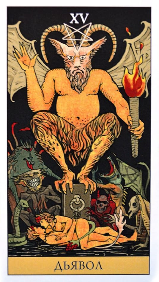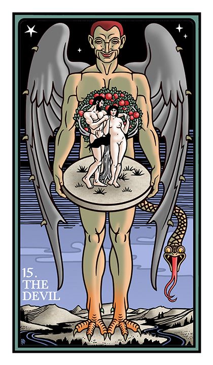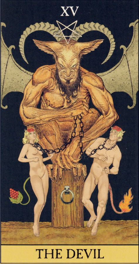 В классической колоде Райдера-Уэйта Дьявол изображен как крылатая фигура, восседающая на темном постаменте. У его ног — двое обнаженных людей, Адам и Ева, прикованных к пьедесталу свободными цепями. Ключевая деталь: они могут снять оковы в любой момент, но не делают этого.