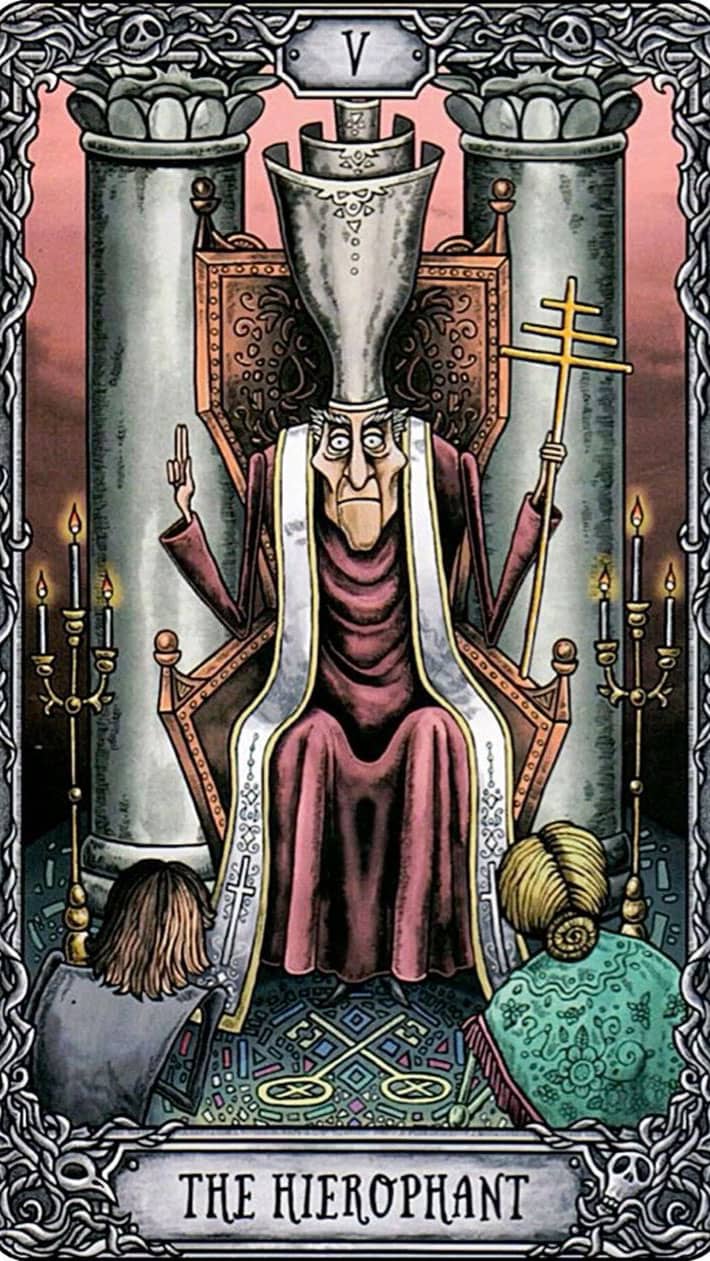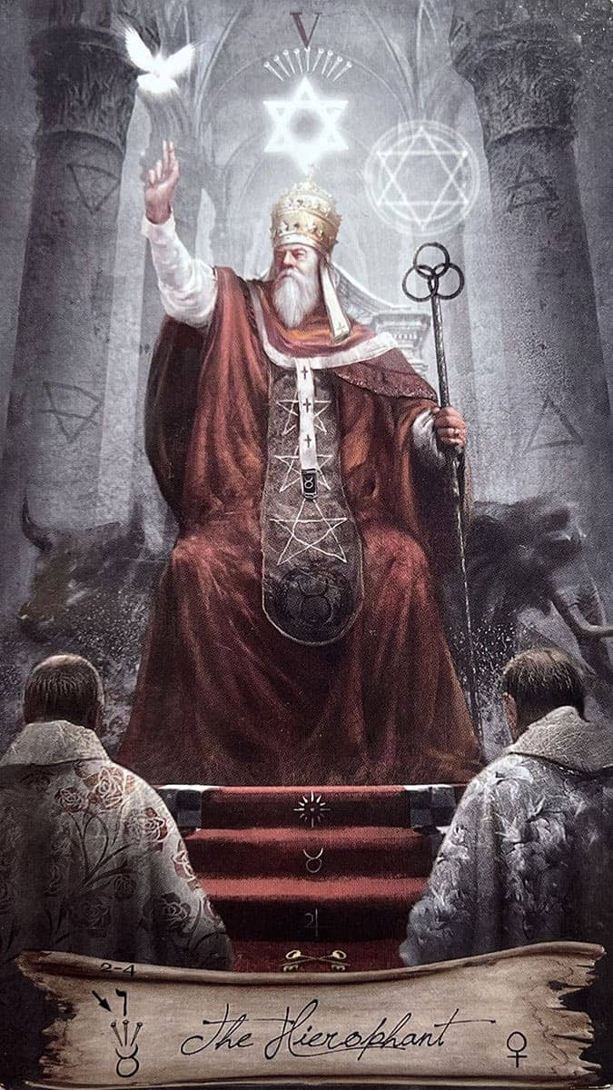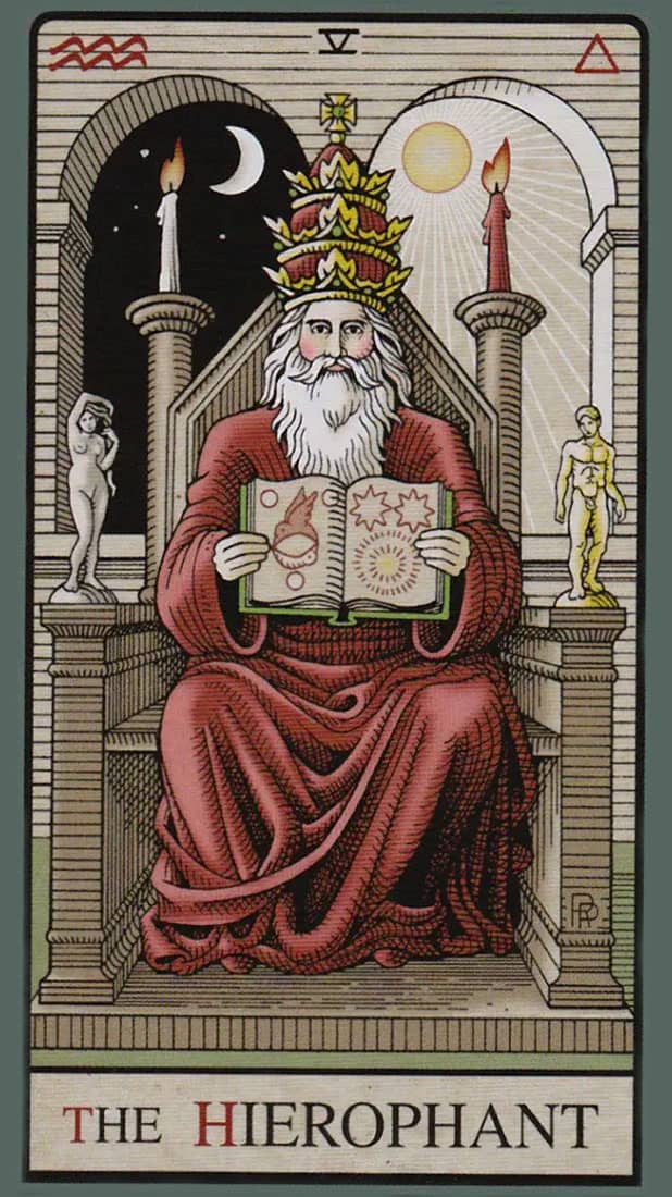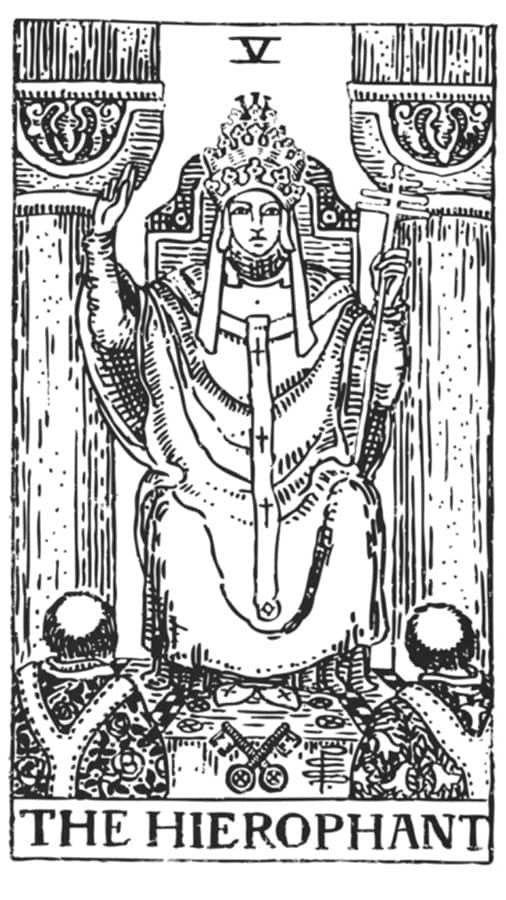 Трон между двух колонн: Как и у Верховной Жрицы, колонны символизируют дуализм, но здесь они обозначают сознательный выбор в пользу традиции и системы. Иерофант — мост между божественным и человеческим.