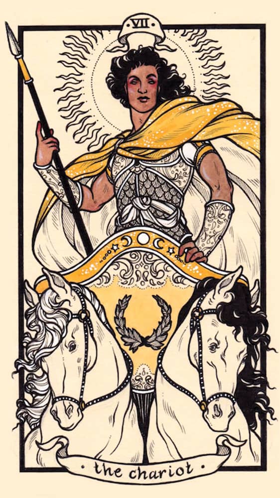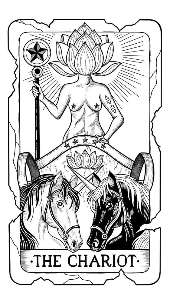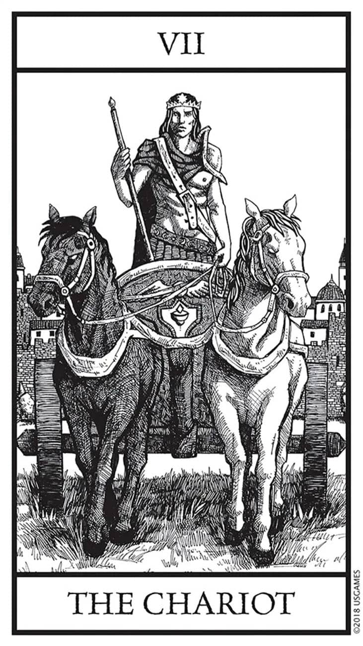 В классической колоде Райдера-Уэйта мы видим могущественного воина в доспехах, стоящего в колеснице и держащего вожжи. Но что делает этот образ по-настоящему мощным — это сфинксы или кони, запряженные в нее, которые часто смотрят в разные стороны.