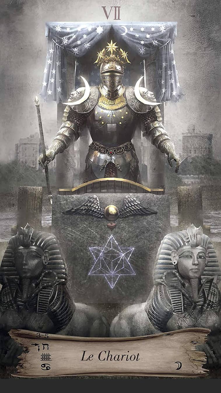 Колесничий в доспехах: Символизирует самодисциплину, готовность к битве, защиту и концентрацию. Его доспехи показывают, что победа требует внутренней стойкости.