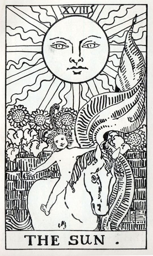 В классической колоде Райдера-Уэйта Солнце изображено как яркий диск с падающими каплями света, под которым скачет обнаженный ребенок на белом коне. На заднем плане — стена и подсолнухи, создающие атмосферу безмятежности и изобилия.