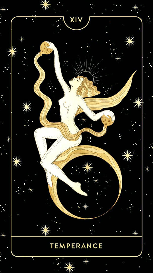 В классической колоде Райдера-Уэйта Умеренность изображается как ангел, стоящий одной ногой на земле, а другой — в воде. В его руках — два сосуда, между которыми переливается жидкость. Этот образ — олицетворение сознательного соединения противоположностей.